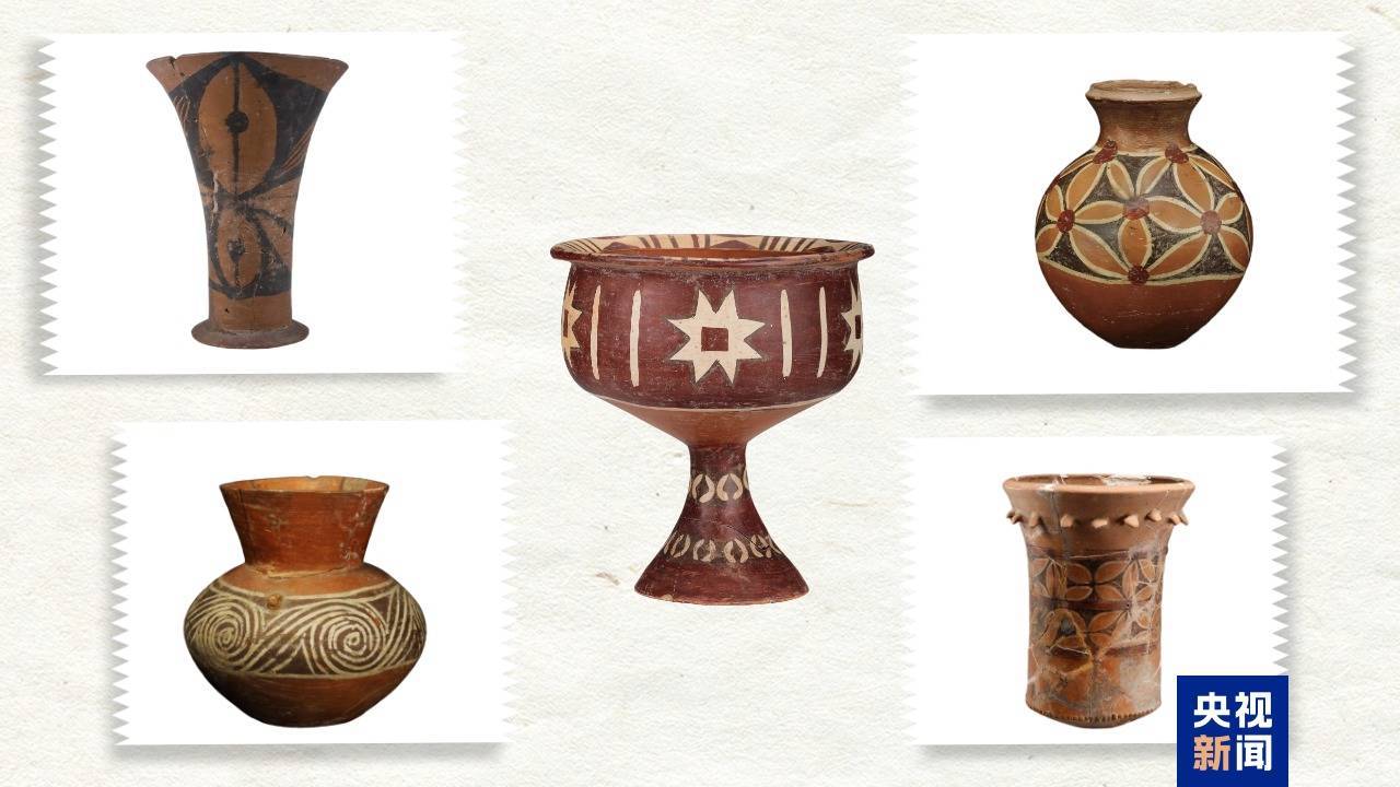 左上:黑彩叶脉纹彩陶杯 济宁市博物馆藏 左下:涡纹彩陶壶 山东博物馆藏 右上:花瓣纹彩陶壶 山东省文物考古商议院藏 右下:彩陶饱读 山东省文物考古商议院藏